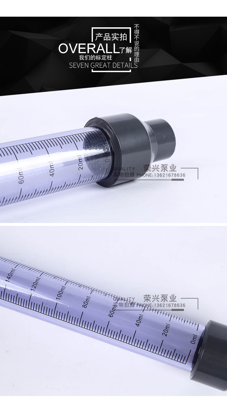 我公司生產的流量標定柱透明管材質有:有機玻璃,透明PVC, 石英玻璃(小容積);